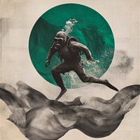 Met een vleugje avontuur doorbreekt een grijze figuur het wateroppervlak terwijl krachtige groene golven om hem heen razen. De duiker, beschermd en vastberaden, lijkt te dansen in harmonie met de mysterieuze diepten van de oceanen, terwijl een lichtgevende cirkel achter hem de verbinding tussen mens en natuur symboliseert.