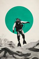 Een duiker drijft in een surrealistische, monochrome golf en duikt in de diepte van het onbekende. De felgroene cirkel achter hem straalt een aura van mysterie uit, terwijl zijn uitrusting een verbinding tussen de mens en de zee symboliseert. Een fascinerend beeld dat aanzet tot avontuur en fascinatie voor de onderwaterwereld.
