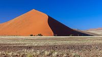 Duin 45 in Namibië kort na zonsopgang. Door de vlakke zon is er een zwarte en een rode kant te bewonderen.