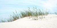 Duin op het Noordzeestrand tegen het licht, met fijn groen gras en helmgras.