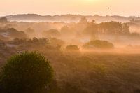 Duingebied Berkheide, Katwijk, Nederland. Duinen in het voorjaar in de mist. Zonsopkomst met wolken en mist boven de duinen. Zonnestralen door het wolkendek (jacobsladder).
