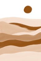 De illustratie toont een schilderachtig landschap van vloeiende bergen, met penseelstreken die de contouren van de duinen in warme, terracotta tinten weergeven. De zon staat hoog aan de hemel. De organische vormen van de duinen contrasteren met de serene lucht erboven. Het geheel ademt een gevoel van rust en warmte uit, en nodigt de…