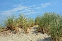 In de duinen aan de Noordzeekust op Zeeland in Nederland met strandgras en blauwe lucht