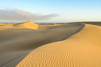 In het warme licht van de avondzon zien de duinen van Maspalomas eruit als een eindeloos golvend zandlandschap. Zachte schaduwen benadrukken de gebogen vormen en maken dat het oppervlak bijna levend lijkt. Het uitzicht strekt zich uit over de gouden heuvels naar de zee, die zachtjes glinstert in het licht in de verte. De laagstaande zon baadt het tafereel in warme gele en oranje tinten en verleent de woestijn aan zee een kalme, bijna meditatieve sfeer.