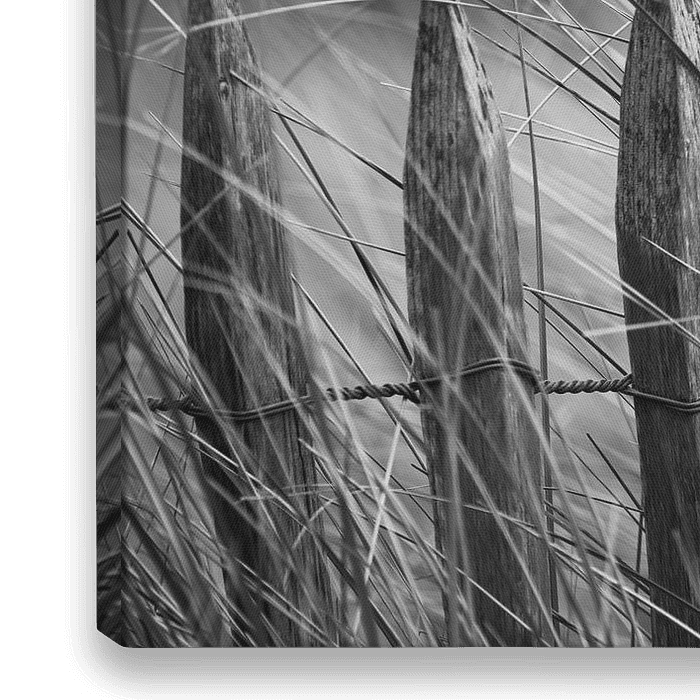 Een stukje duinen in Oostende aan de Belgische kust , omgezet in zwart-wit . Het wiegende duingras en de typische houten afsluiting en steken mooi af tegen de zachte achtergrond .