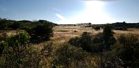 een duinvallei bij. de zon zakt langzaam in de verte de laatste duinenrij , Het Hollandse duinlandschap glooit langs onze kustlijn