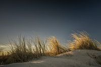 De landschapsfoto "Dünengras I" toont een zandduin begroeid met grassen, verlicht door de zon onder een donkerblauwe hemel. Genomen op het strand van Schillig aan de Noordzee op een zonnige en heldere avond in winter 2025.