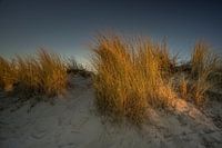 De landschapsfoto "Dünengras II" toont een zandduin begroeid met grassen in het avondlicht onder een donkerblauwe hemel. Genomen op het strand van Schillig aan de Noordzee op een zonnige en heldere avond in winter 2025.