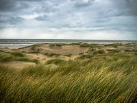 Het gras in de duinen danst in de wind heen en weer. De ze op de achter grond en de donkere wolken zeggen dat het guur weer is.