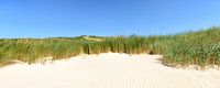 Panorama van duinen met duingras of helmgras bij het Noordzeestrand op een zomerse dag in het natuurgebied Schoorlse Duinen in Noord-Holland.