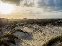mooie duinpan, met de zon die ondergaat. Veel zand met een paar mensen die het duin op klimmen, en in de verte zie je hele lichte mist.