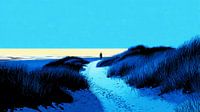 Dit kunstwerk toont een eenzame wandelaar die over een zacht kronkelend zandpad door hoge duingrassen richting de kust loopt. De silhouet van de persoon steekt donker af tegen een adembenemende lucht vol diepe blauwtinten die langzaam overgaan in warme oranje en gele tinten bij de horizon. De reflectie van het licht op het water en de…