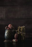 Duister en donker stilleven foto met fruit en kaarsen. Een mooie moderne beeldende kunst compisitie van kaarsen, lychees, een tinnen beker en hout.