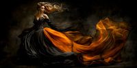 Mysterieuze vrouw in een zwart met gouden wervelende jurk.