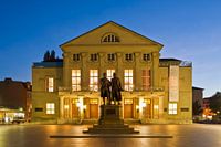 Goethe- en Schiller-monument 's avonds voor het Nationaal Theater aan de Theaterplatz in Weimar.