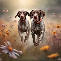 Koop dit digital art kunstwerk Duitse Korthaar Pointer spelend in een bloemenveld van Johannas Art Creations als reproductie op canvas, aluminium dibond, (ingelijste) fotoprint, behang en ArtFrame, op maat geprint in Fine-Art kwaliteit.