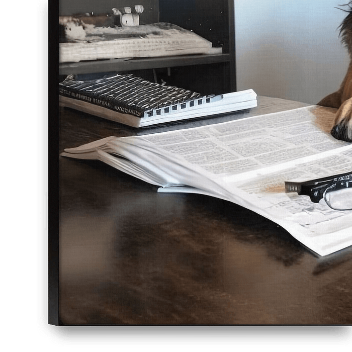 Koop dit digital art kunstwerk Duitse herder achter bureau van Harvey Hicks als reproductie geprint op canvas, aluminium dibond, (ingelijste) fotoprint, behang en ArtFrame. Voor jou op maat geprint in Fine-Art kwaliteit.