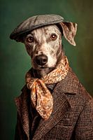 Met zijn charmante uiterlijk en stijlvolle outfit bestaande uit een slim jasje, een elegante hoed en een sjaal straalt deze Duitse waakhond een onnavolgbare persoonlijkheid uit. Zijn zachte ogen en opvallende oren geven hem een vleugje intelligentie, terwijl de algehele look een gevoel van tijdloze elegantie uitstraalt.