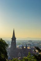 Duitsland, Avondlicht boven de Minster van Freiburg im Breisgau, een beroemd uitzicht op de skyline van deze prachtige stad bij zonsondergang