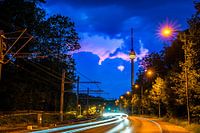 Duitsland, Beroemd oriëntatiepunt van de stad stuttgart de televisietoren, genaamd fernsehturm bij nacht met wazig verkeer terwijl een elektrische storm komt in de zomernacht