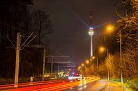 Duitsland, Donkere nacht hemel over beroemde stuttgart televisietoren of tv toren gebouw achter drukke straat van verkeer en trams in bos van de stad