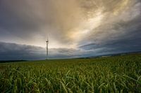 Duitsland - Enkele windgenerator op eindeloze brede groene graanvelden bij zonsopgang met dramatische lucht