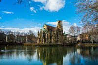 Duitsland, beroemde stuttgart feuersee gotische kerk omgeven door water van een meer in het centrum van de stad stadsgezicht met blauwe hemel en wolken dag