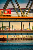 Architectuur, buiten, buitenopname, spoorweg, bouw, beweging, Billhafen, brug, stad, dijk, Duits, Elbe, Europa, Europees, vloot, rivier, water, groothandelsmarkt, haven, dokken, Hafencity, Hamburg, Hammerbrook, Hanzestad, overstroming, overstromingsbeschermingssysteem, industrie, industrieel monument, industrieel, kanaal, verlaten, ochtend, ochtendstemming, lokaal verkeer, niemand, openbaar, openbaar vervoer, landschap, landschapsformaat, S-Bahn, bescherming, skyline, stad, stadsgezicht, stedelijk, route, vervoer, vervoermiddel, stedelijk, verbinding, verkeer, landmark, water, trein