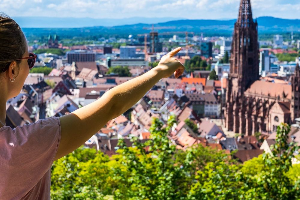 Duitsland, Jong Blond schoonheidsmeisje die zich boven daken van stad freiburg im breisgau historisch district en populaire kathedraal van muenster in de zomer met blauwe hemel bevinden
