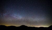 Duitsland, Miljoenen sterren van melkwegstelsel boven silhouet van zwarte bosbomen in donkere nacht in zomer