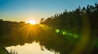 Duitsland, Stuttgart, Magische zonnestralen achter boom en bospilhouet die in water van meer baerensee weerspiegelen