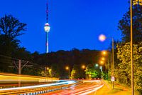 Duitsland, Stuttgart, Nacht Sfeer in de stad bij tv toren wolkenkrabber fernsehturm naast verkeersweg