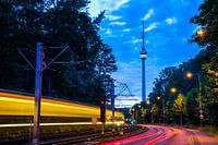 Duitsland, de televisietoren van de stad Stuttgart en magische lichten van het drijvende auto's en tramverkeer in schemerstemming na zonsondergang in de zomer