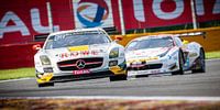 De ROWE Mercedes-Benz SLS AMG GT3 versus Ferrari 458 GT3 in Les Combes tijdens de 24 uren van Spa 2015. Blancpain Endurances Series, Circuit van Spa-Francorchamps, België.