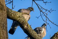 Deze duiven paar zijn rustig aan het genieten van het uitzicht vanuit de boom in het park.