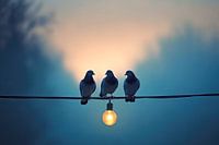Deze sfeervolle en artistieke afbeelding toont drie duiven die op een elektriciteitsdraad zitten, net boven een enkele gloeilamp die zachtjes oplicht. De achtergrond heeft een mistige, dromerige uitstraling met een warme gloed van een ondergaande of opkomende zon, wat een gevoel van rust en mysterie creëert. De silhouetten van de duiven…