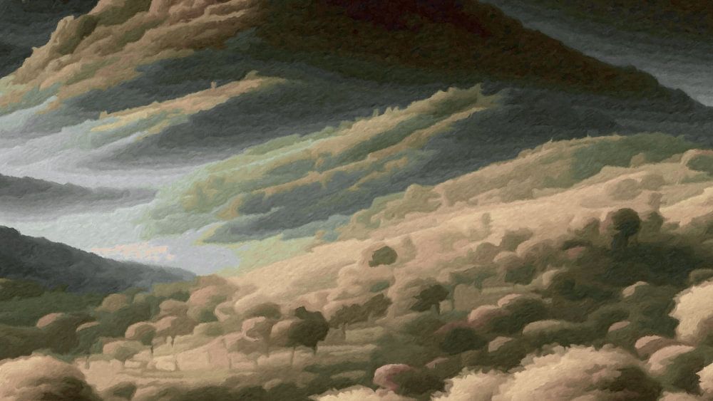 De vallei met duizend bergen, heuvels en bomen is digitaal gemaakt. Het zachte licht van de zon geeft de vallei een warme, uitnodigende sfeer. De grillige rotsachtige bergen en boomrijke heuvels strekken zover als het oog kan zien. Twee bomen staan nog vol in de roze bloesem. In de dalen hangt hier en daar nog wat mist. Het is een prachtige lentedag in tinten beige, bruin, groen, blauw en een tikkeltje roze.