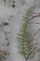 Het had 's nachts gesneeuwd maar dat ging in de ochtend al snel smelten. Dit is het blad van de duizendblad met een randje sneeuw. Door de zware sneeuw was het takje ondersteboven gaan hangen.