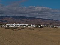 Uitzicht over de beroemde zandduinen van Maspalomas aan de zuidkust van het eiland Gran Canaria, Canarische Eilanden, Spanje op een zonnige dag met wolken boven de bergen en witte hotelgebouwen.