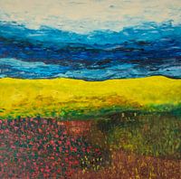 Kleurrijke acrylverf met spatel en kwast opgebracht, waarbij de kleuren voorzichtig mengen. De lucht is ruw in verschillende kleuren blauw opgebracht met spatel.