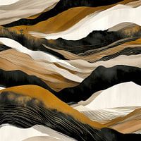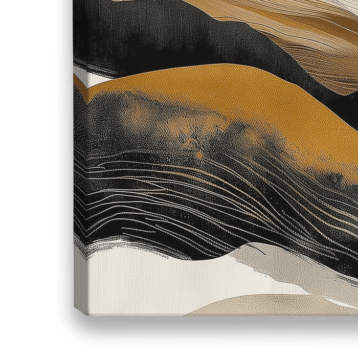 Abstract landschap, samengesteld uit gelaagde en golvende lijnen als uitgestrekte duinen en heuvels. De kleuren zijn aards en rijk, variërend van diepzwart tot zandbeige, okergeel en ivoorwit, wat het beeld een natuurlijk en rustgevend gevoel geeft.