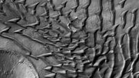 Zwartwit fotokunst van duinen en een krater op de planeet Mars met mooie surreeele patronen en textuur.