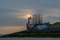Tijdens zonsondergang raakt de zon nog net het baken van het windorgel in Vlissingen.