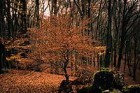Landschap op het Duno landgoed in Doorwerth, op de Veluwe in Gelderland, met zicht op een boompje met prachtige oranje herfsbladeren. Op de achtergrond zie je het duistere bos.