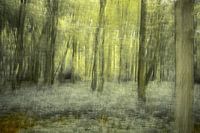 Landschap in het bos. Hier is gebruik gemaakt van ICM, ofwel intentional camera movement, waarbij de camera tijdens een langere sluitertijd wordt bewogen in een bepaalde richting. Dit zorgt voor een dynamisch en schilderachtig effect.
