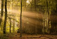 Landschap op landgoed Duno in Doorwerth, Gelderland. De zon komt langzaam op en werpt een prachtig warm licht en zonneharpen in het bos, wat mooie herfstkleuren vertoont.