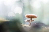 Close up van een paddenstoel op het Duno landgoed in Doorwerth, Gelderland. De foto is gemaakt vanuit een laag standpunt, waardoor de onderkant goed te zien is.