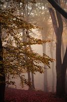 Landschap op het landgoed Duno in Doorwerth op een mistige ochtend in de herfst. De nadruk ligt op de prachtig gekleurde bladeren.