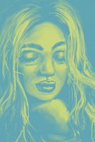 Kunstwerk van een vrouw met gesloten ogen. Uitgevoerd in duotone met groengeel en blauwe kleuren. Deze frisse kleuren geven een lente gevoel aan je muur.