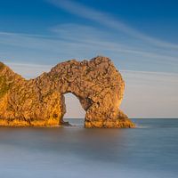 Een vierkante foto van een avond bij Durdle Door (soms geschreven Durdle Dor), een natuurlijke kalkstenen boog aan de Jurassic Coast in de buurt van Lulworth in Dorset, Engeland.